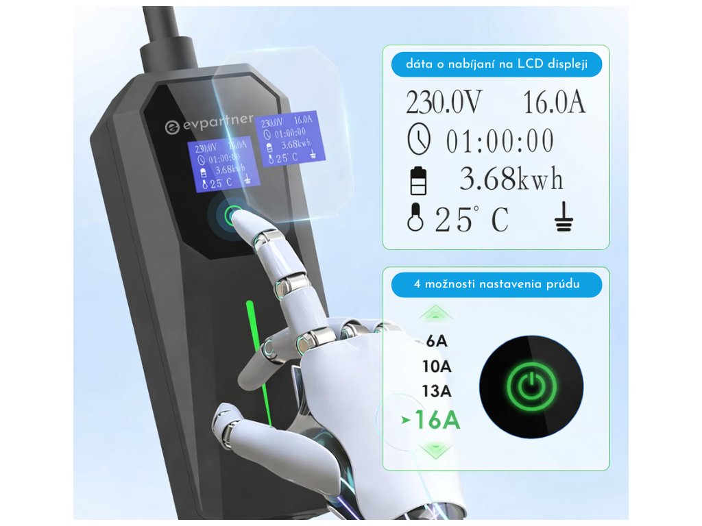 Naše nabíjačky disponujú možnosťou nastavenia vlastného prúdu nabíjania. Ak ste si nie istí, akou rýchlosťou a výkonom sa môžete nabíjať, na našej nabíjačke si môžete tlačidlom nastaviť nižší prúd a výkon, čím zabránite možnému preťaženiu a komplikáciám. Na výber je 6 A, 10 A, 13 A, 16 A (od 1,2 kW až po 3,6 kW).