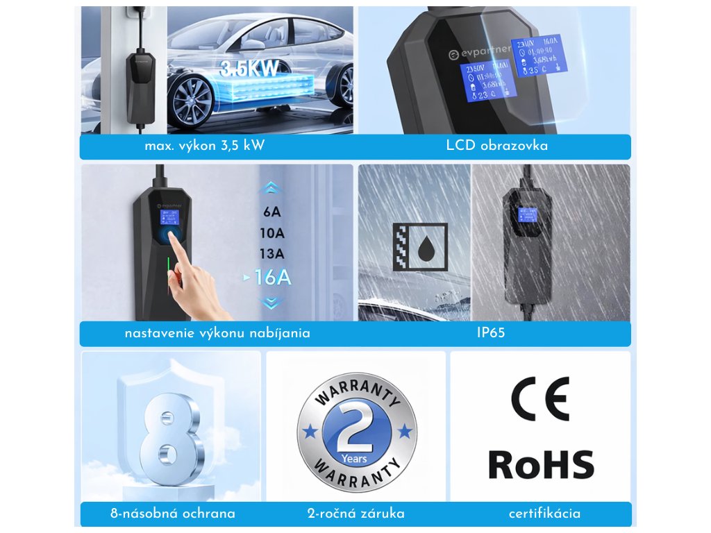 - Maximálny nabíjací výkon až 3,6 kW 16A pri 230 V